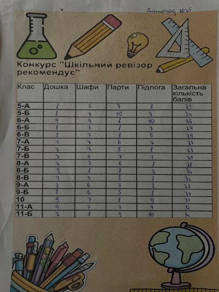 Маємо приємний прогрес – у класах стало значно чистіше. Дякуємо всім, хто докладає зусиль! Та все ж залишаються недоліки: безлад у шафах, пил на полицях і сміття під партами. Це дрібниці, але саме вони формують загальну картину.